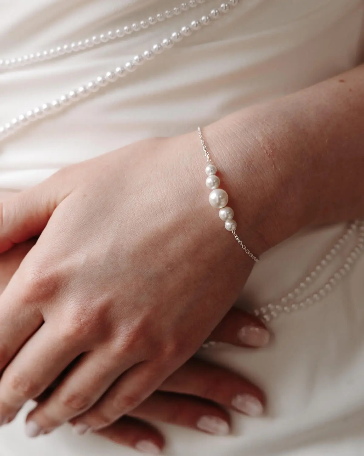 Entdecke unser elegantes Muschelperlen Armband ANNOUK aus 925er Sterling Silber. Das stilvolle Design mit unterschiedlich großen, runden Perlen macht die Armkette zum perfekten Accessoire für die Hochzeit. Ein zeitloses Schmuckstück, das jeden Look edel abrundet.