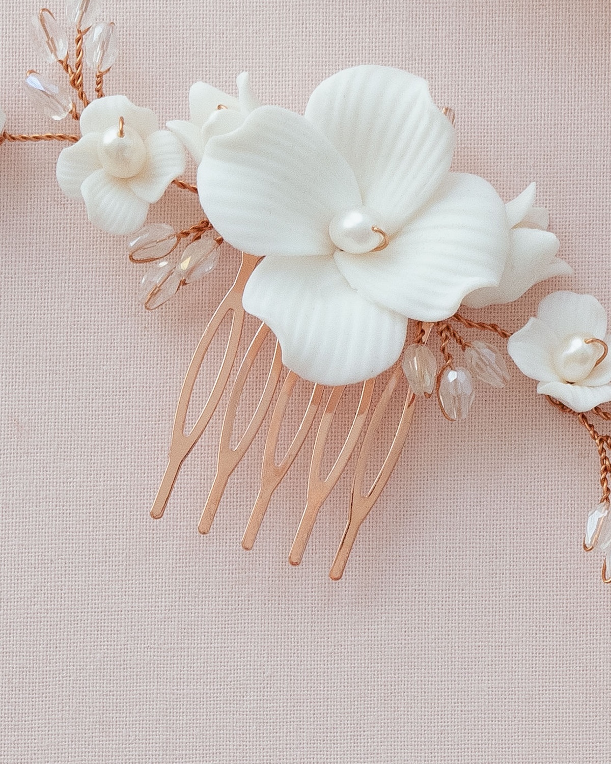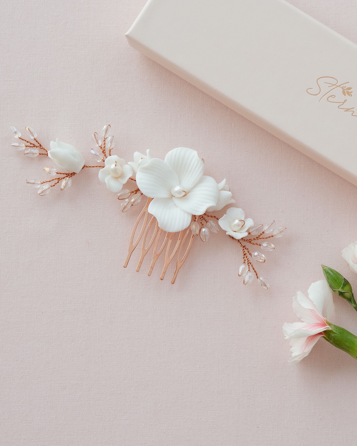 Entdecke unseren filigranen Braut Haarkamm ALBA – Die perfekte Ergänzung für deine Brautfrisur. Dieser florale Haarschmuck ist nicht nur ein Blickfang, sondern auch ein Zeichen für Stil und Klasse. Mit liebevoll gestalteten Keramikblumen, echten Süßwasserperlen und funkelnden Kristallperlen verleiht er deinem Hochzeitslook einen Hauch Eleganz. Egal, ob du dich für eine hochgesteckte oder halb offene Frisur entscheidest, der Haarkamm lässt sich dank flexibler Drähte mühelos an jede Brautfrisur anpassen. Der Kopfschmuck eignet sich zudem wunderbar als Schleierabschluss.