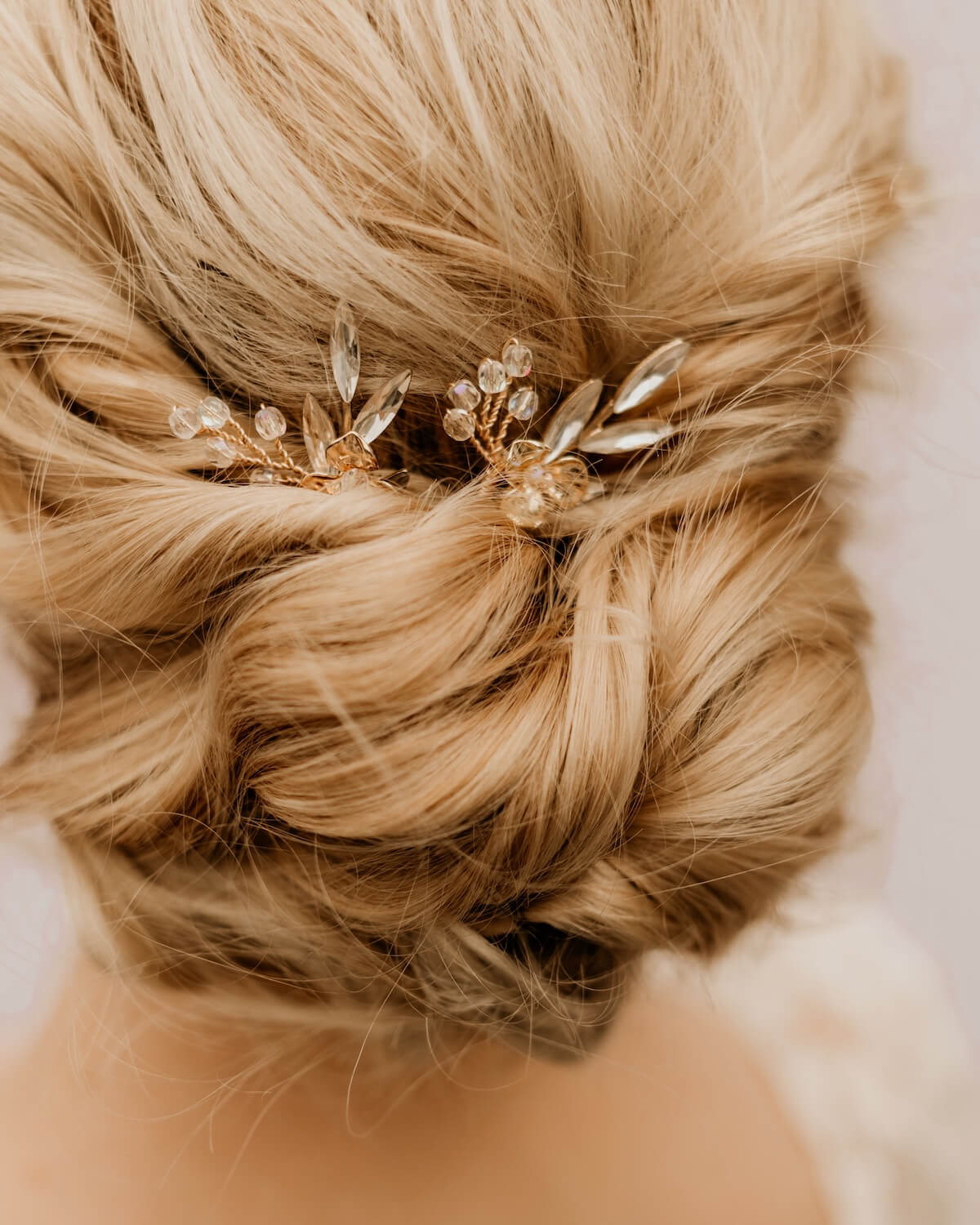 Goldfarbene Haarnadeln AMELIA mit Strass Blatt und Kristallperlen von Sternenauge