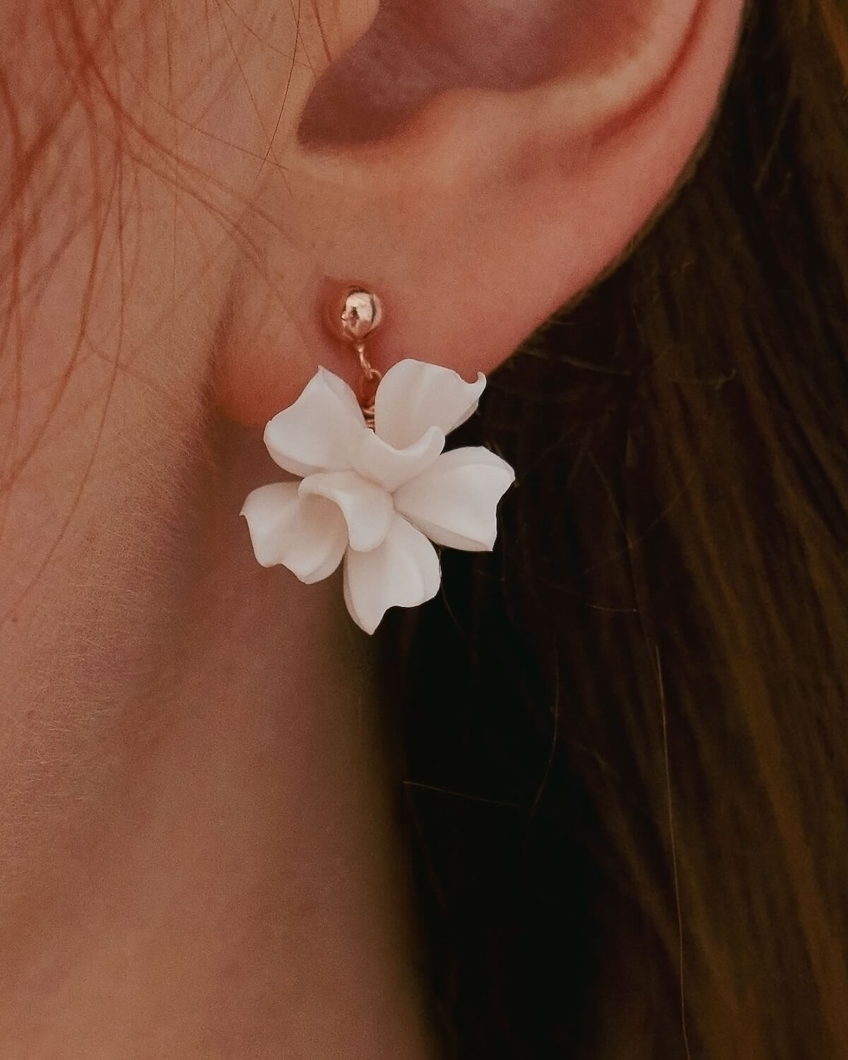 Roségoldfarbene Ohrstecker mit weißer Blume VALERIA von SternenaugeSternenauge zarte Blumen Ohrringe mit weißen Blüten VALERIA Detailfoto am Ohr
