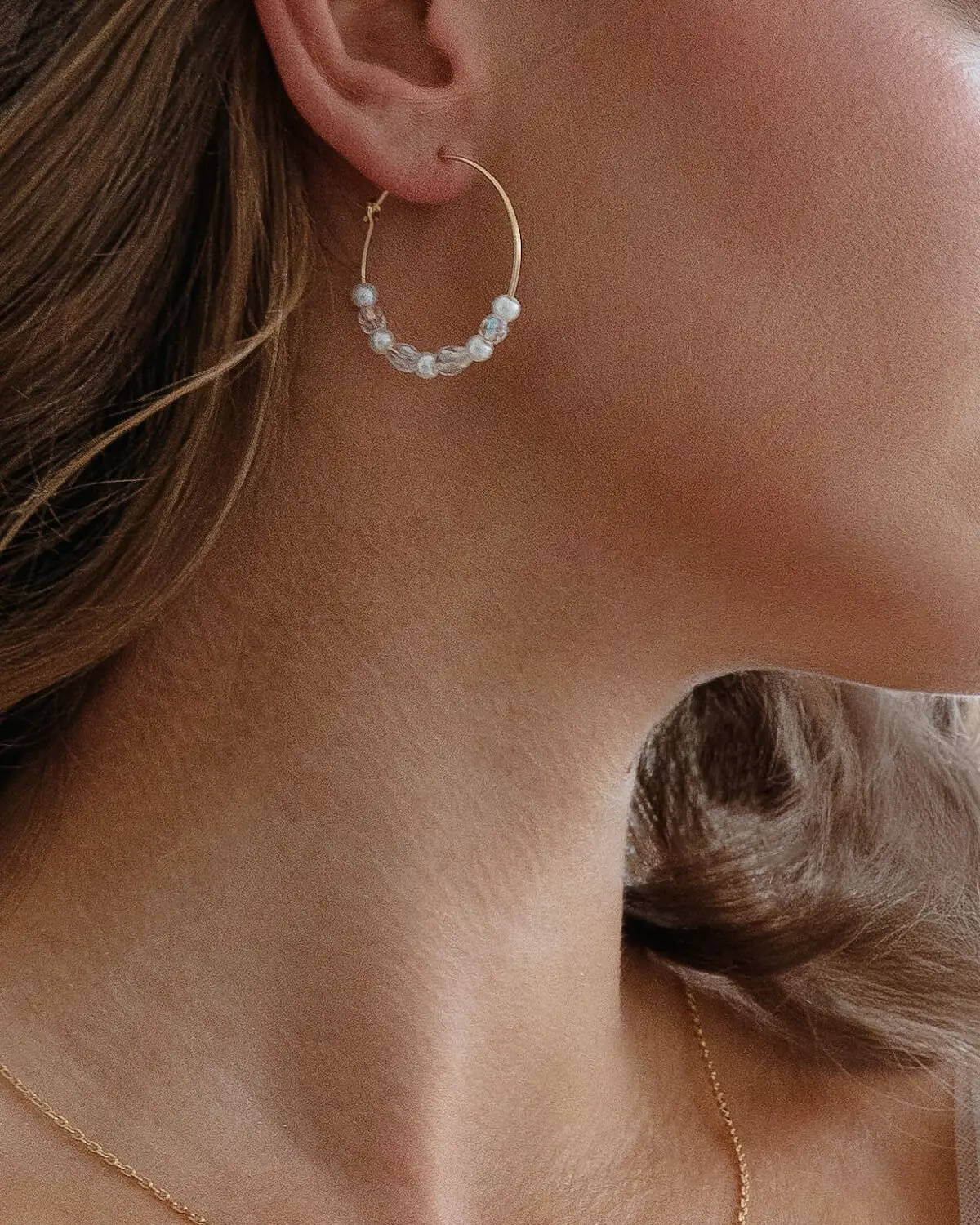 Mit unseren federleichten Creolen ALEXIS aus echtem 925er Sterling Silber verleihst du deinem Hochzeitslook eine moderne, glänzende Note. Die Kombination aus kleinen Perlen und funkelnden Glitzerperlen fängt das Licht bei jeder Bewegung ein und harmoniert wunderbar mit der aktuellen Brautmode mit Glitzerdetails. Und wenn du es nach der Hochzeit schlichter magst, kannst du die Perlen einzeln variieren oder die Creolen ganz ohne Perlen tragen.