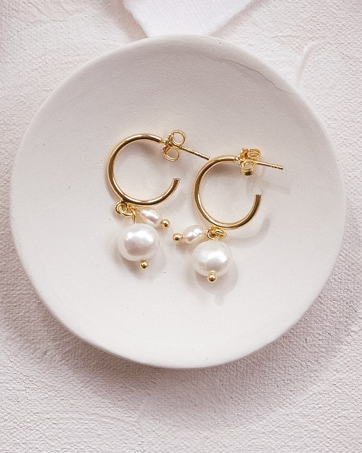 Diese hübschen Creolen Stecker mit schimmernden Süßwasserperlen bestehen aus feinem 925er Sterling Silber und sind das perfekte Accessoire für Bräute, die sich einen modernen Look mit eleganten Details für ihren großen Tag wünschen. Der Ohrschmuck ist leicht und angenehm zu tragen.