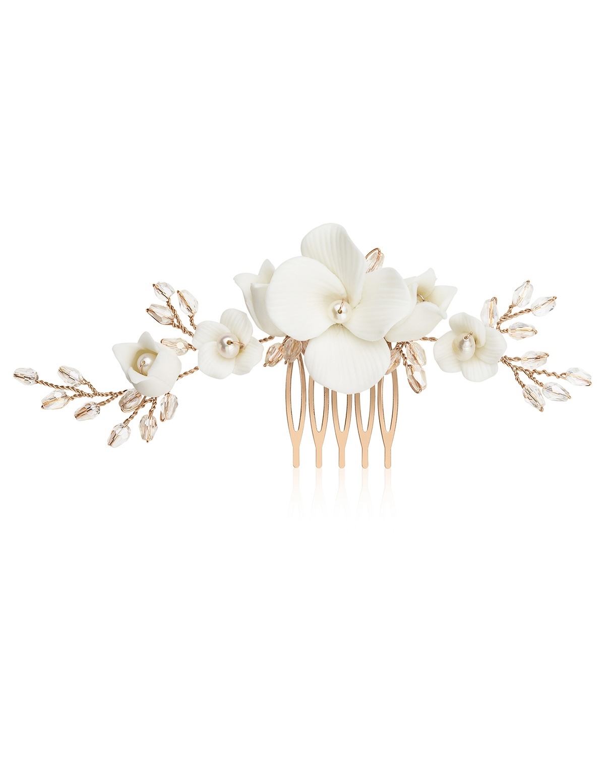 Dieser wunderschöne Haarkamm ist mit Keramikblumen gestaltet, die der Natur nachempfunden sind und deiner Brautfrisur eine bezaubernde Note verleihen. Funkelnde Glaskristallperlen sorgen für strahlende Akzente und echte Süßwasserperlen bringen einen sanften Glanz in das Schmuckstück.