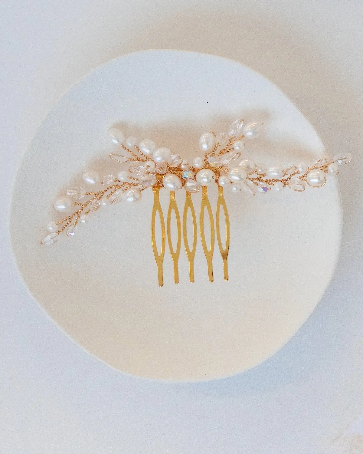 Mit unserem stilvollen Haarkamm ALEXIS verleihst du deiner Brautfrisur eine ganz persönliche Note, denn die flexiblen Drähte passen sich ideal an deine Wünsche an. Die Kombination aus echten Süßwasserperlen, schimmernden Glasperlen und glitzernden Glaskristallperlen harmoniert perfekt mit den aktuellen Brautkleid-Trends. Jedes Stück ist liebevoll handgefertigt und sorgt für ein elegantes Funkeln in deiner Frisur.