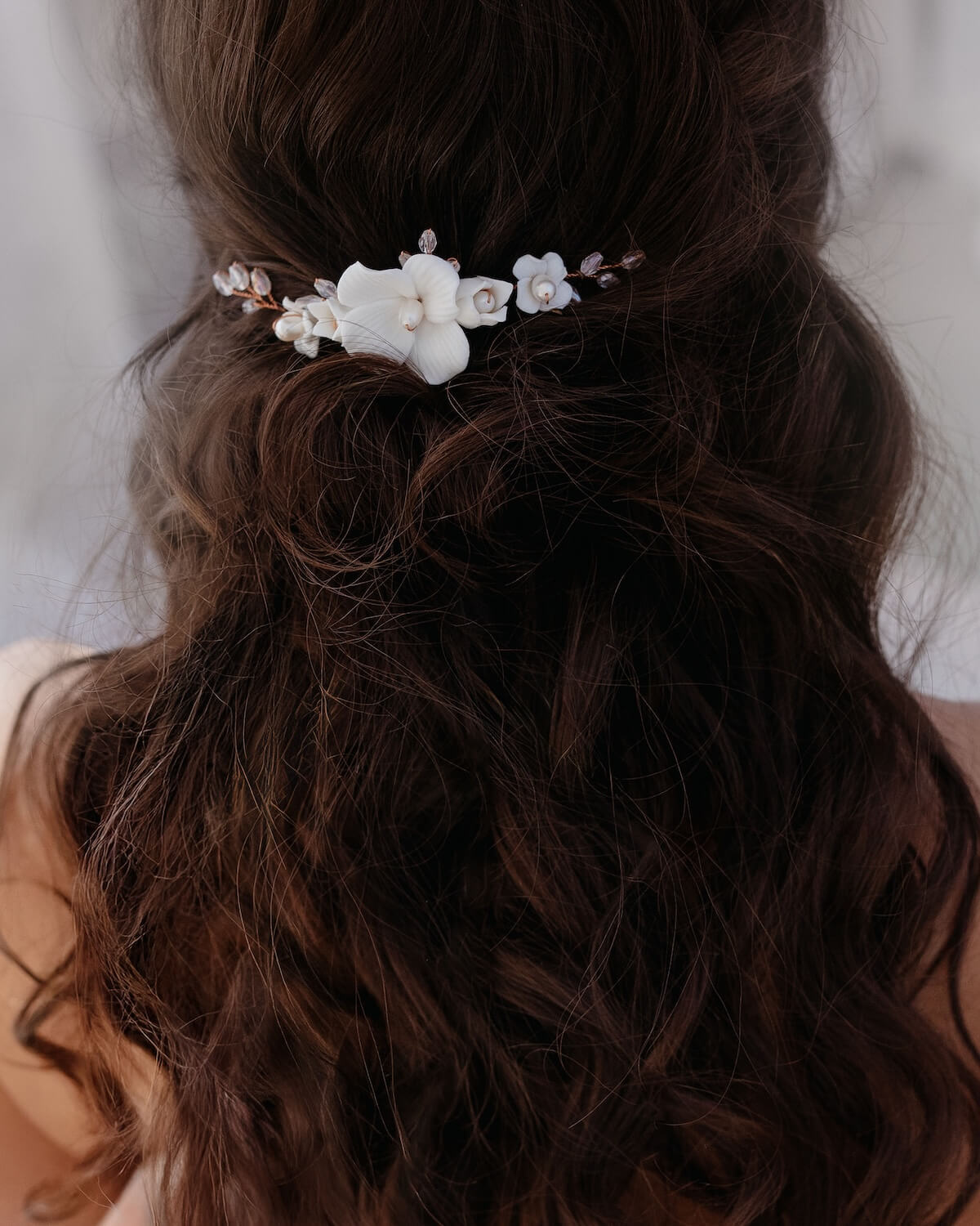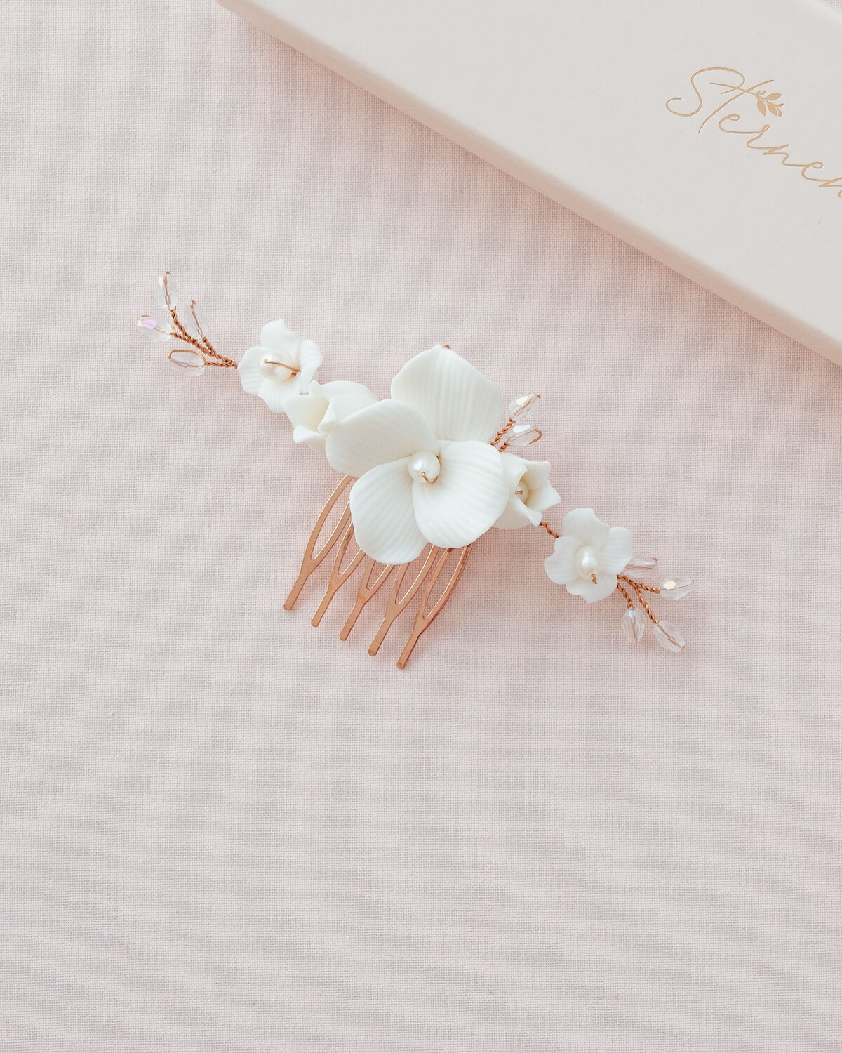 Blumen und Knospen aus Keramik bringen zarte Details in das HaarschmuckstĂĽck und sorgen fĂĽr einen eleganten Look. Diese fein gearbeiteten Elemente verleihen dem Accessoire eine wundervoll natĂĽrliche und filigrane Note.