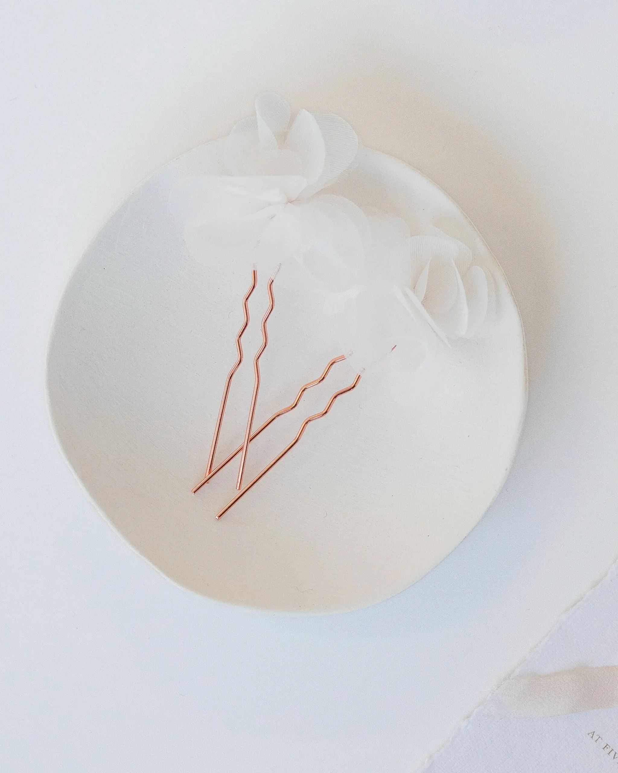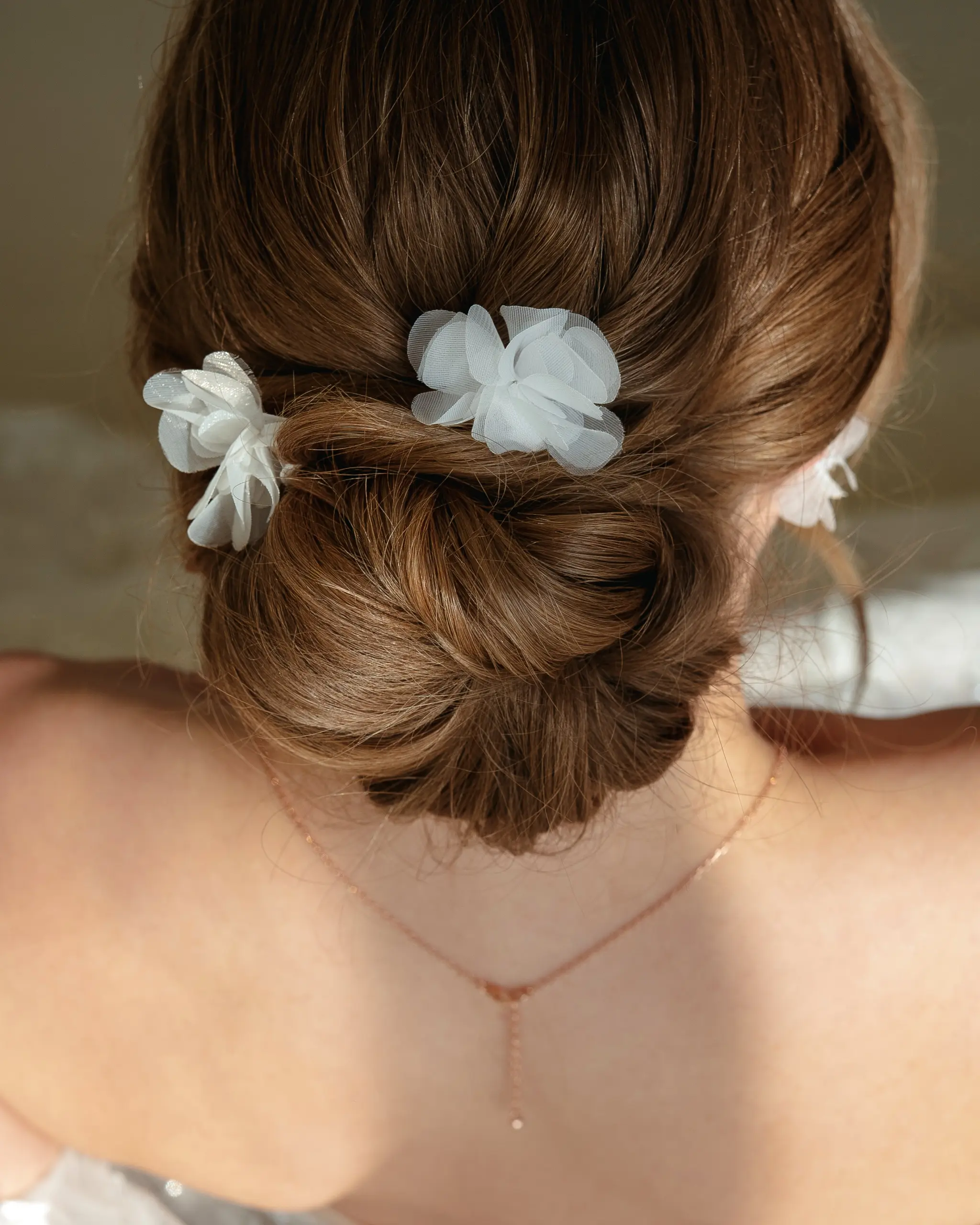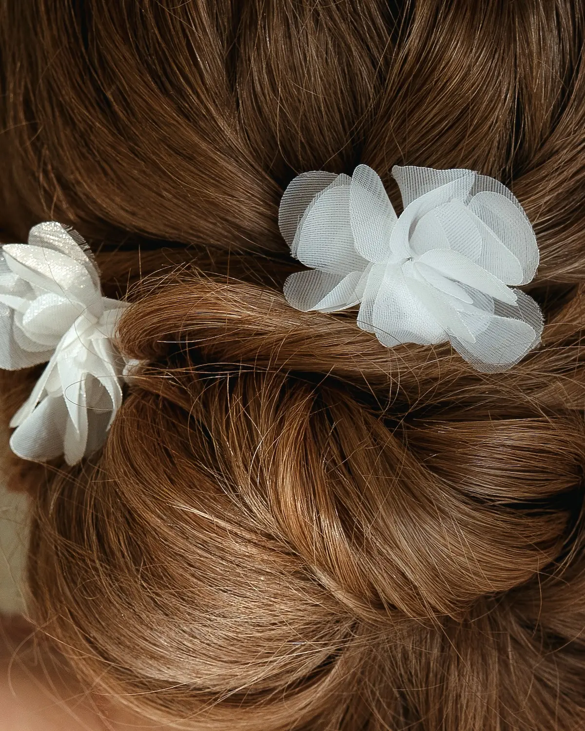 Unsere zarten Haarnadeln CARRY mit Organza-Blüten sind das perfekte Accessoire für deine Hochzeitsfrisur und verleihen dir einen schlichten und doch wirkungsvollen Look. Ob du dich für eine elegante Hochsteckfrisur oder romantische Wellen entscheidest, dieses 2-er Set fügt sich nahtlos in die Frisur ein und setzt subtile Akzente. Trage sie einzeln oder zusammen, um deinen Look mit florale Raffinesse abzurunden.