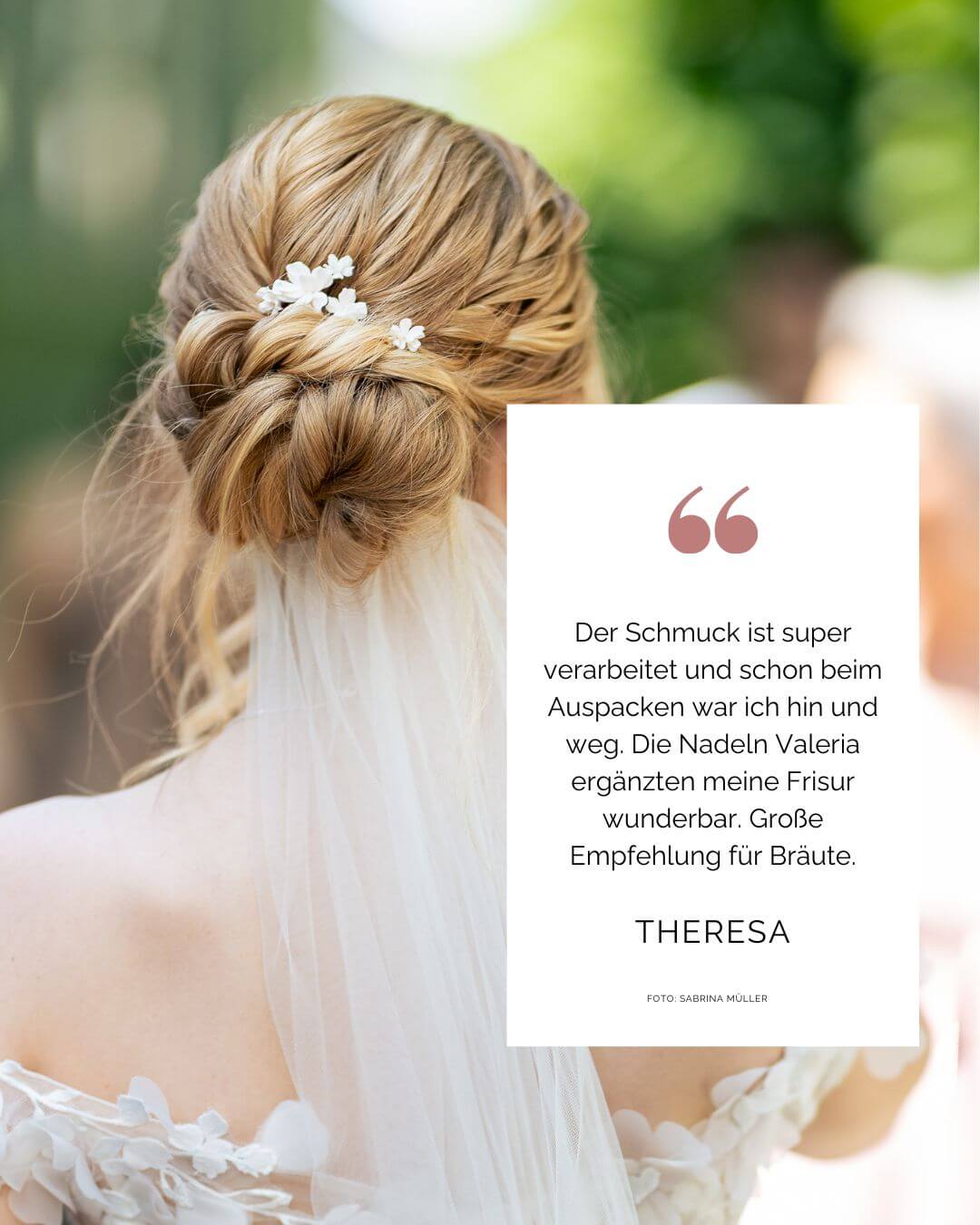 Ich habe für meinen Brautschmuck die Linie Valeria gewählt, unter anderem diese wundervollen Haarnadeln. Zu meinem mit Tüllblümchen besetzten Kleid wollte ich floralen Schmuck ganz ohne Perle und Glitzer – Valeria war dafür die perfekte Wahl.
