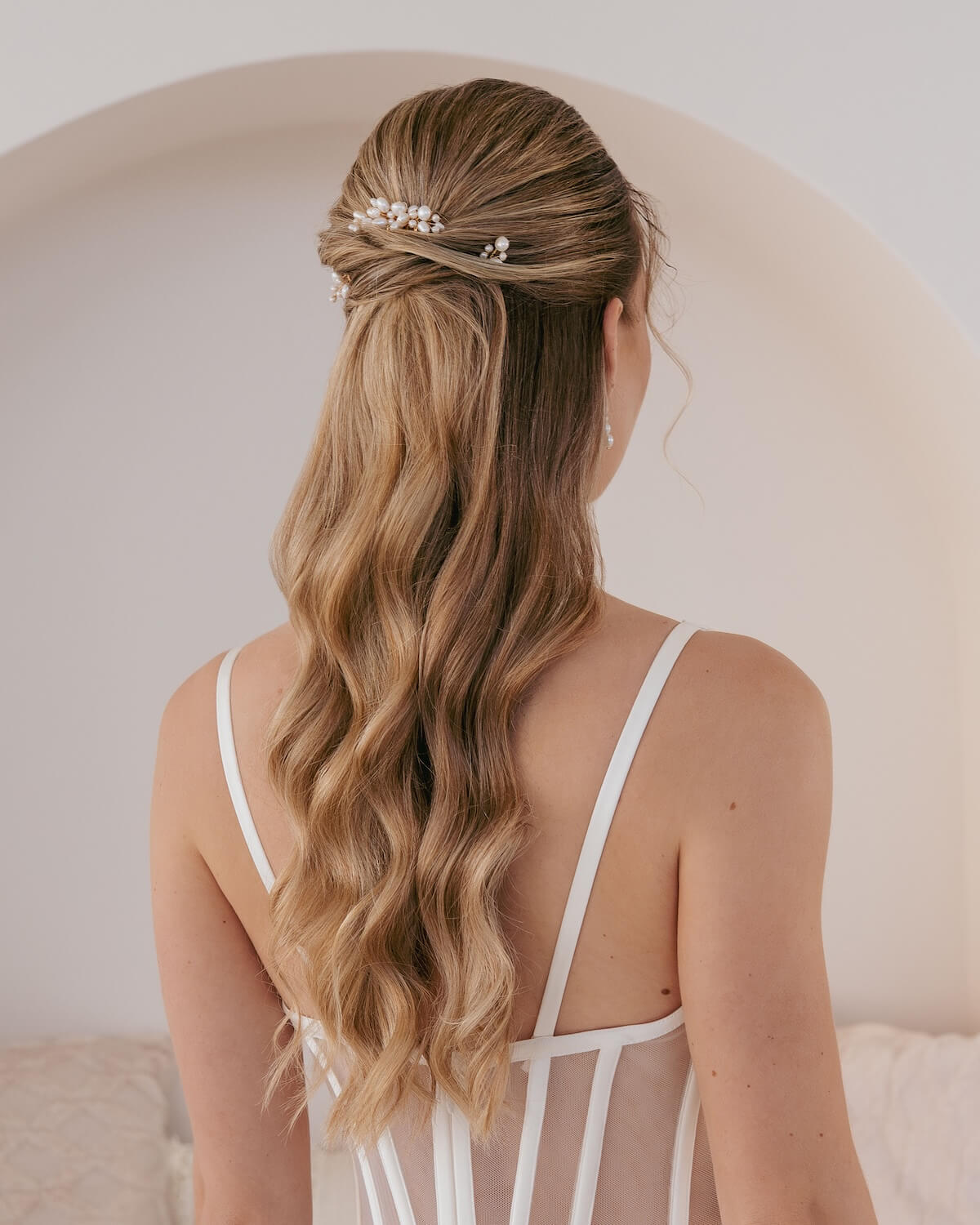 Unser NORA Haarschmuck-Set wird mit echten Süßwasserperlen hergestellt und umfasst einen eleganten Haarkamm sowie zwei filigrane Haarnadeln. Perfekt für wunderschöne Brautfrisuren und abgestimmt auf den aktuellen Classy Bride Trend.