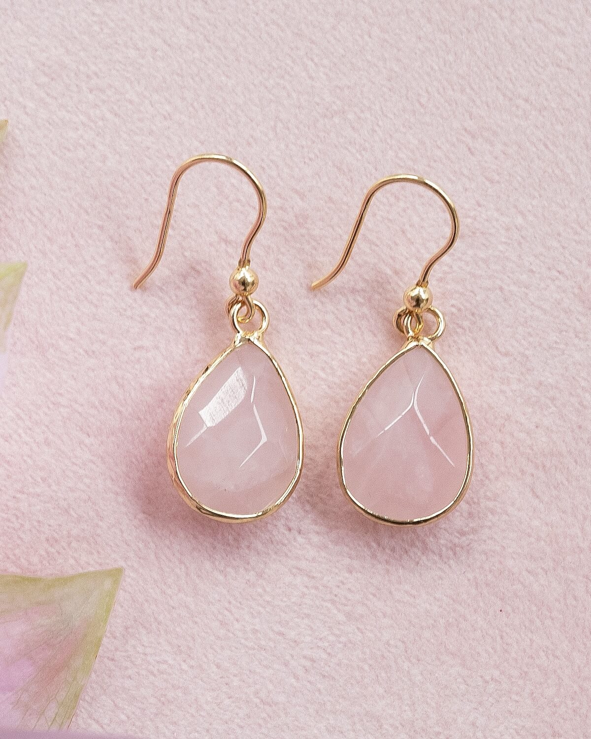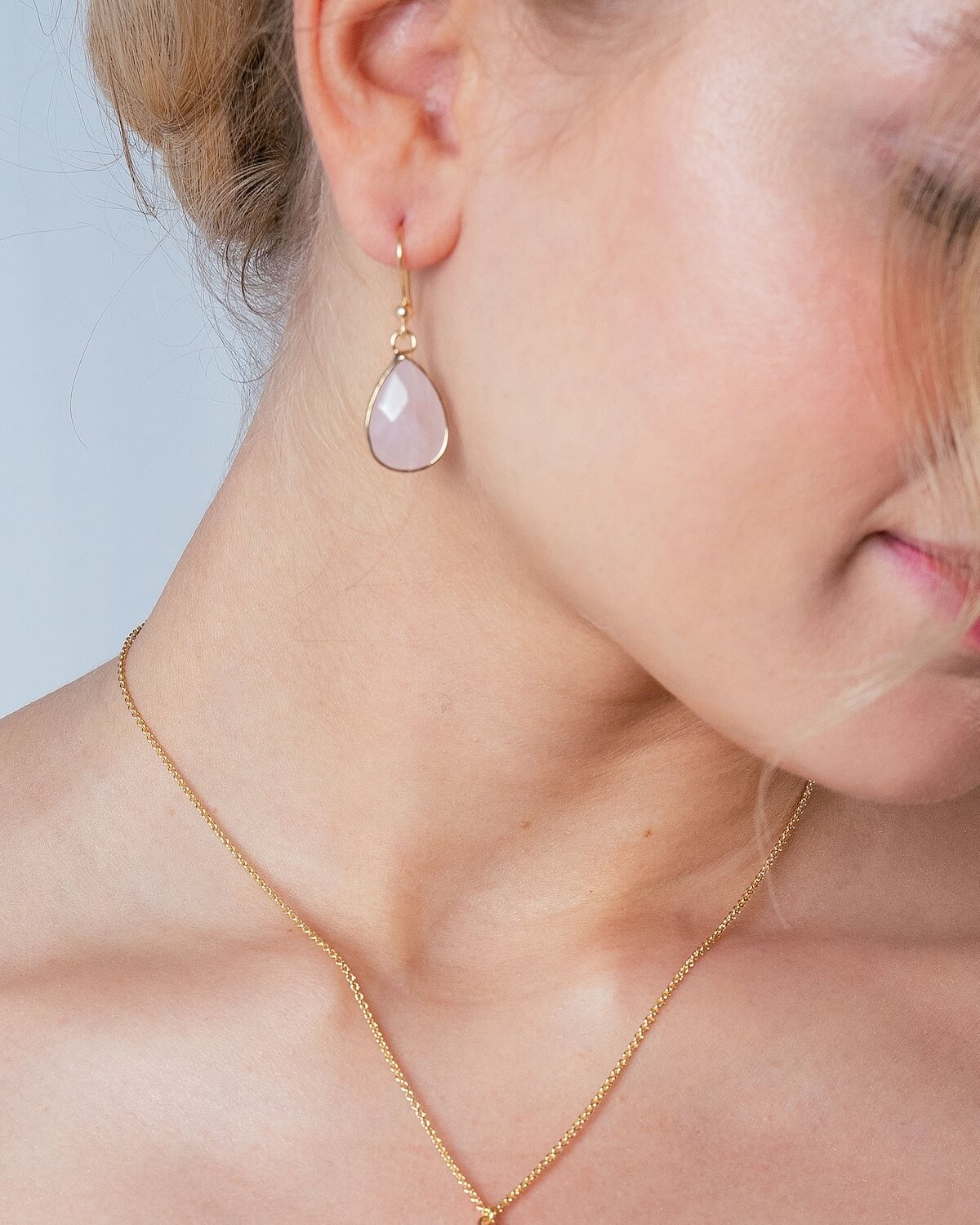 Verleihe deinem Brautlook eine sanfte, natürliche Note mit unseren tropfenförmigen Ohrringen AMY mit zarten Rosenquarz Anhängern. Der Ohrschmuck sorgt für einen femininen Look. Perfekt für alle Bräute, die an ihrem großen Tag mit natürlichen Elementen strahlen möchten.