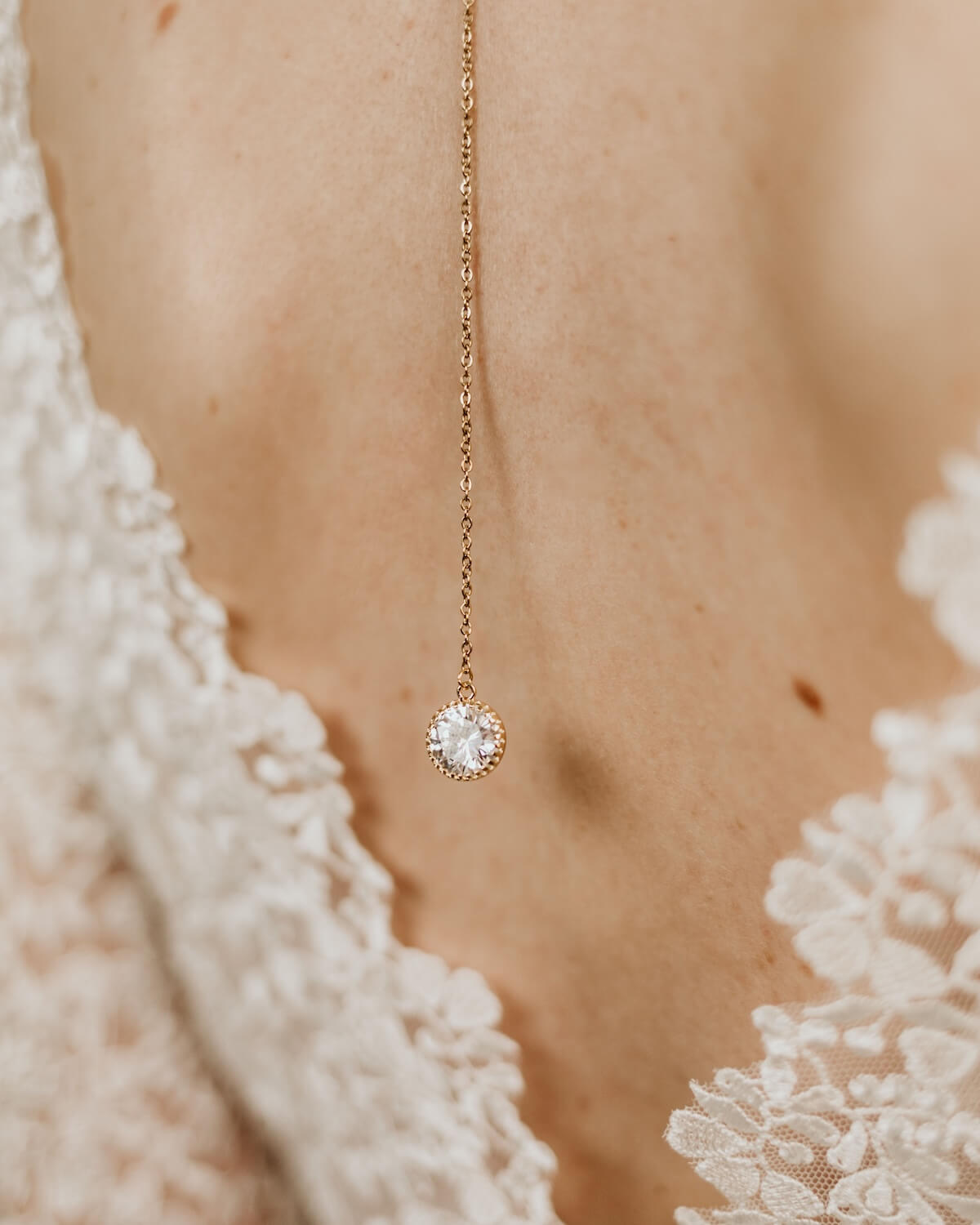 Unsere durchgängigen Rückenketten werden über Kopf angezogen. Daher empfehlen wir die Kette bereits vor dem Styling anzulegen, damit sie sich später nicht in der Brautfrisur verheddert. Unsere Rückenketten Einhänger kannst du einfach in den Karabiner deiner Halskette einhängen.