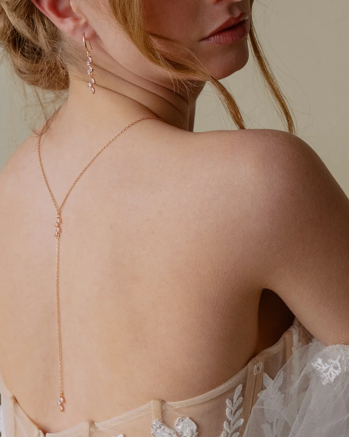Unsere durchgängigen Rückenketten werden über Kopf angezogen. Daher empfehlen wir die Kette bereits vor dem Styling anzulegen, damit sie sich später nicht in der Brautfrisur verheddert. Unsere Rückenketten Einhänger kannst du einfach in den Karabiner deiner Halskette einhängen.