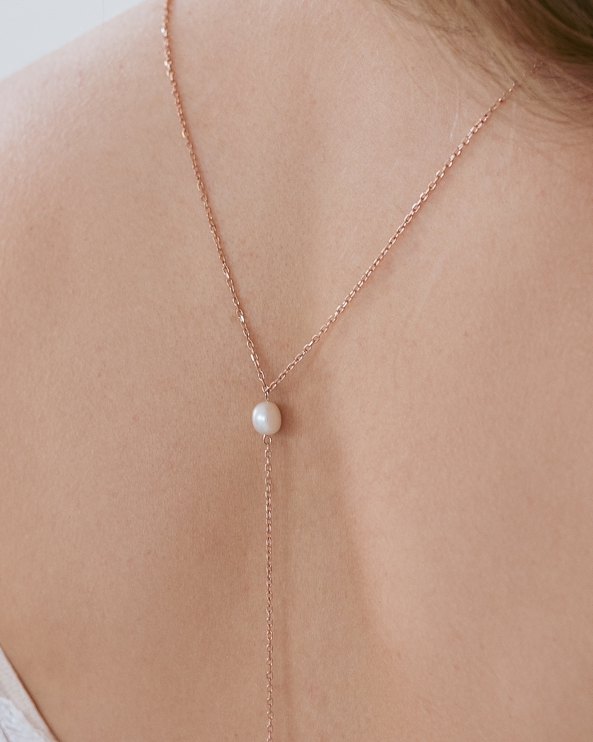 Entdecke unsere elegante Rückenkette mit Perlen, die mit ihrem modernem Design perfekt für im Rücken tief ausgeschnittene Brautkleider geeignet ist. Diese Kette mit echten Süßwasserperlen verleiht deinem Brautlook eine besondere Note und betont die Schönheit deines Rückens.
