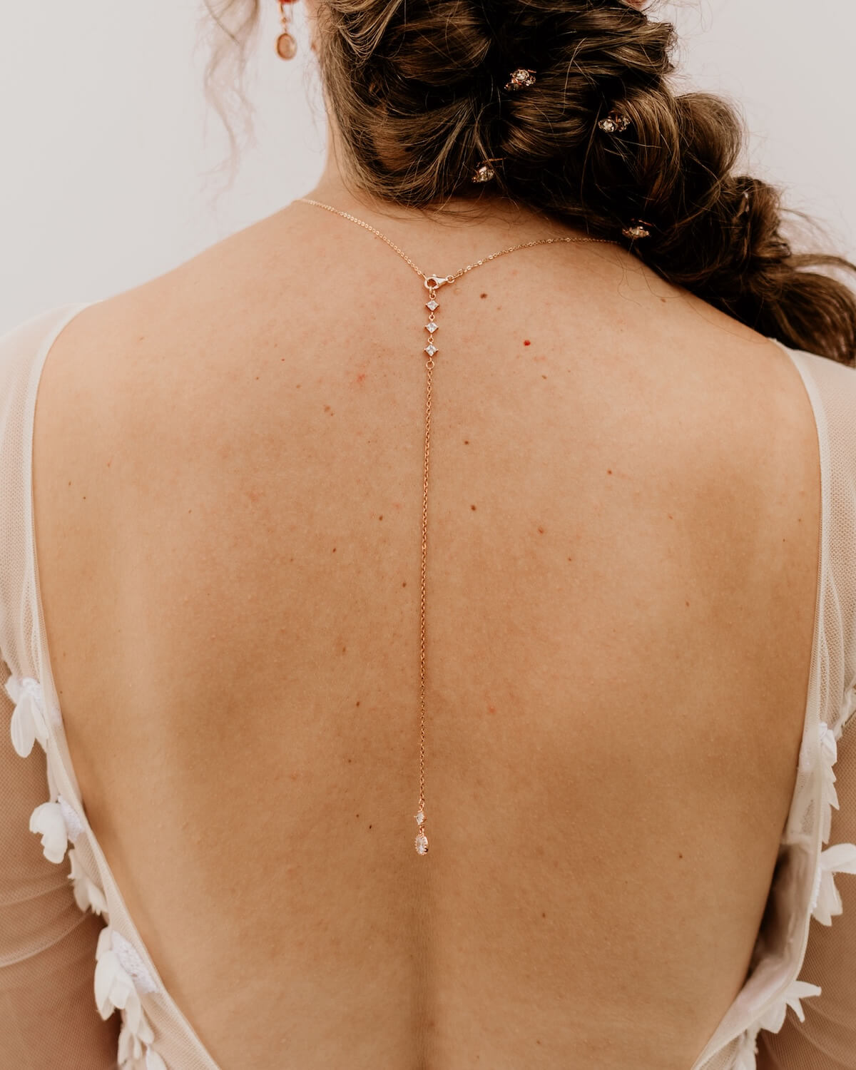 Unsere durchgängigen Rückenketten werden über Kopf angezogen. Daher empfehlen wir die Kette bereits vor dem Styling anzulegen, damit sie sich später nicht in der Brautfrisur verheddert. Unsere Rückenketten Einhänger kannst du einfach in den Karabiner deiner Halskette einhängen.